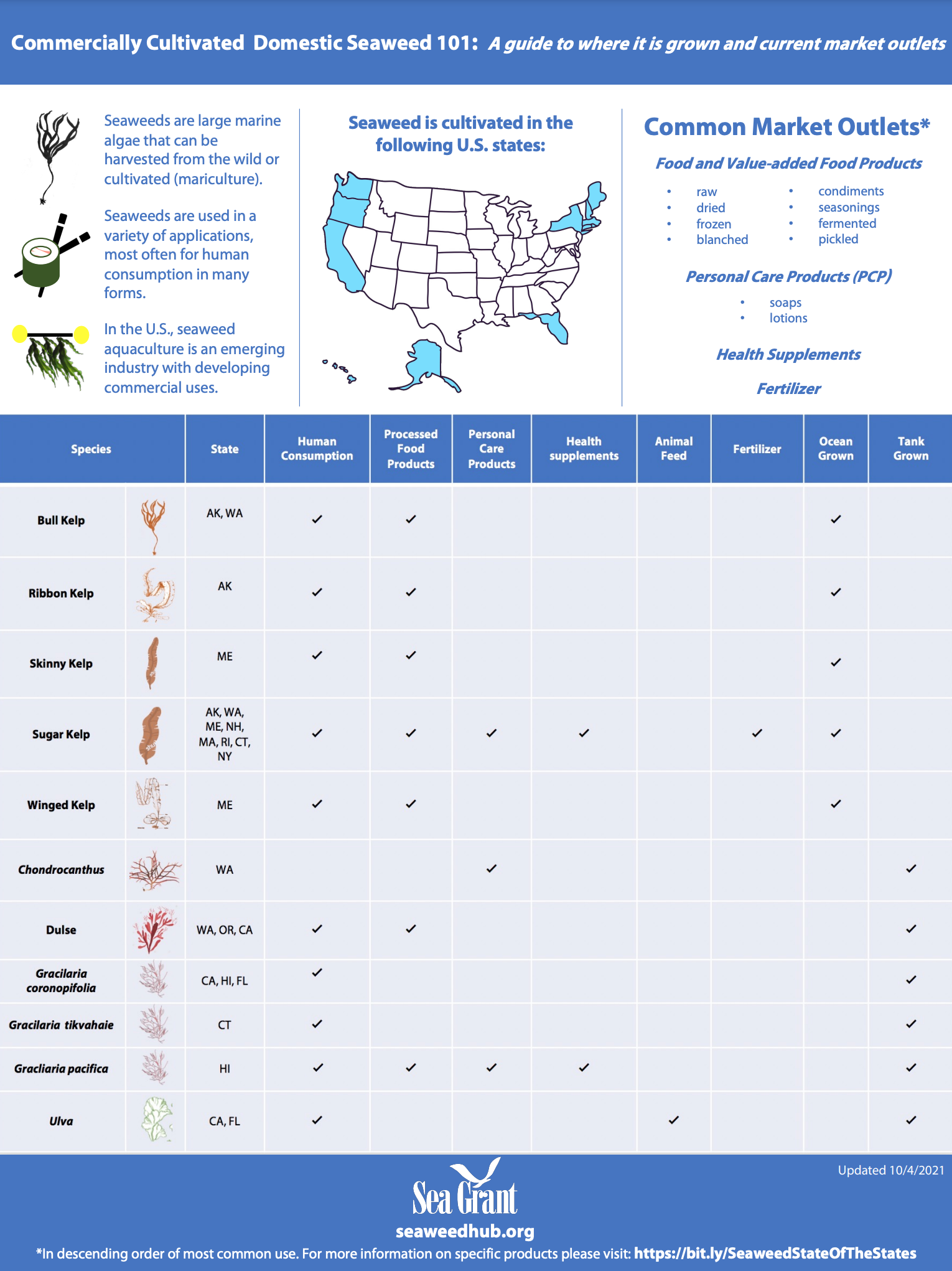 The following infographic provides an overview of seaweed species grown commercially in the United States and their current market outlets. This infographic is free to download.